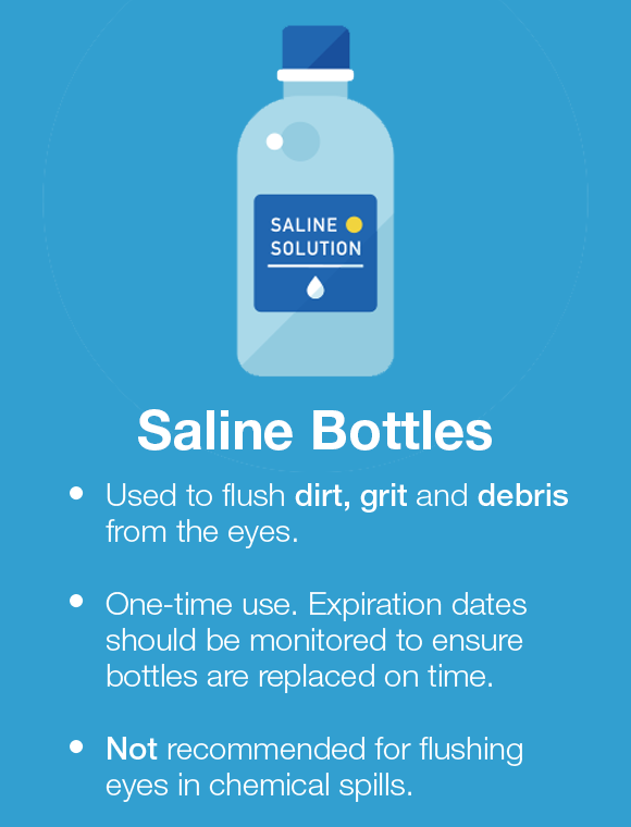 Saline eyewash bottles certainly have their place: they are useful for one-time rinsing of debris, such as dust or grit, and as a supplementary measure for the casualty to keep rinsing their eyes during transport to medical care. It should be noted that these bottles have an expiry date and should be replaced, on average, every 2 years, even if they remain unopened.